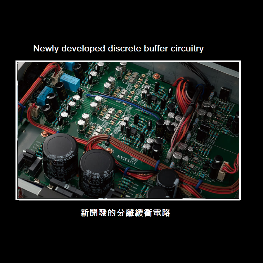 作為處理數位音源的部件,驅動機構的高精度信號讀取和先進的數位信號處理非常重要,但決定最終音質的高性能類比輸出電路是最重要的因素。LUXMAN 設計的高端零件期望的能呈現具深度的音樂表現。D-07X 有一個新開發的 I/V 轉換系統,接收成對的 BD34301EKV DAC 晶片的輸出,在單聲道模式下運行,為四個分離完美匹配的放大器模組供電。高質量緩衝電路降低了輸出信號的阻抗。該裝置可強大地驅動任何集成放大器或控制放大器,這些放大器將成為下一級機種的零件。此外,對於數位播放機至關重要的聽覺範圍內的濾波是在緩衝級而不是獨立的LPF級中執行,能夠再現自然流暢的類比波形,獲得更高的清晰度和更直接的音質。